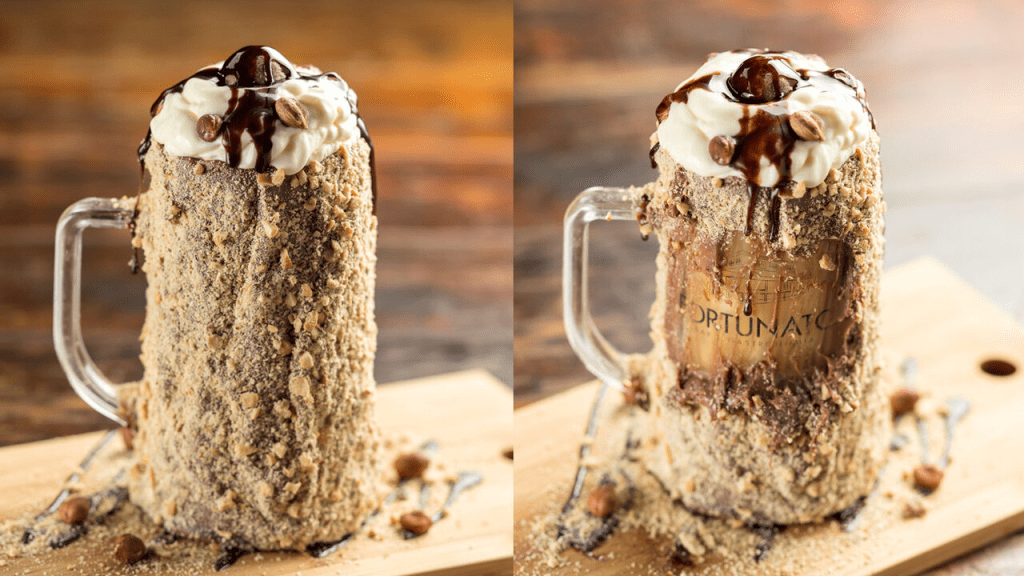Quer uma sobremesa divertida? O Pleasure Chopp é uma criação que simula uma caneca de chopp, mas é feita de brigadeiro, farofa crocante e muito sorvete de creme. Um doce divertido e superinstagramável para animar o passeio.